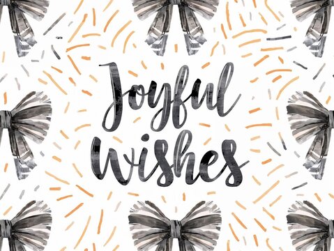Hand-lettered bow design: Gestural watercolor bows in oversized striped patterns, playful script 'Joyful Wishes,' decorative scribble fills, lighthearted and tactile