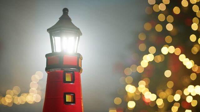 Festive lighthouse with santa hat in winter coastal scene