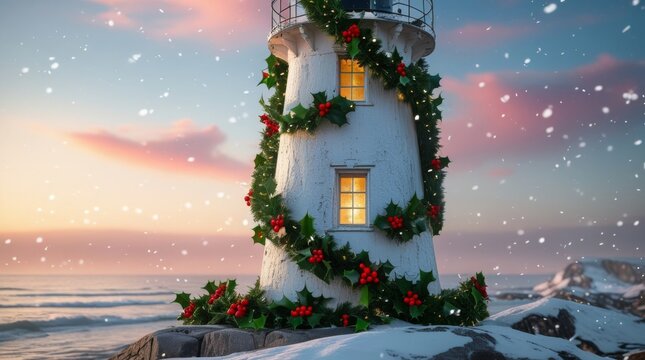 Classic white lighthouse with a rustic texture and subtle worn details, wrapped in lush green garlands intertwined with vibrant red holly berries and delicate snowflakes gently falling