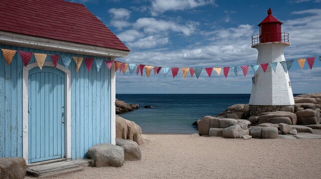 Serene lighthouse under azure skies, maritime beacon of hope and solitude; celebrate World Lighthouse Day, maritime heritage, tranquil seascape