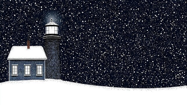 Snowflakes falling on a lone lighthouse on a rocky coast, 4K hyperrealistic photo