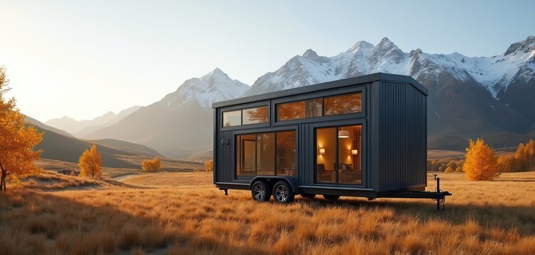 Modern tiny house on wheels situated in picturesque meadow with mountains. Sleek design, large windows provide natural light. Contemporary cabin offers sustainable, cosy, stylish living space for