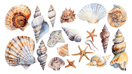 The image shows a variety of seashells and starfish. The shells are of different colors and sizes.