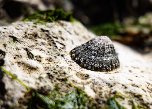 Closeup  of Single large patelliform limpet (sea snail) attached to a seaweed covered rock on the beach sharp focus with blurred background