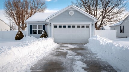 Snow-covered residential home with a clear driveway, surrounded by white snowbanks and leafless trees, showcasing a serene winter landscape and inviting atmosphere