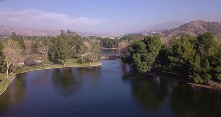 Aerial footage flying through a beautiful park with lake, family and some far off city views in Yorba Linda, CA