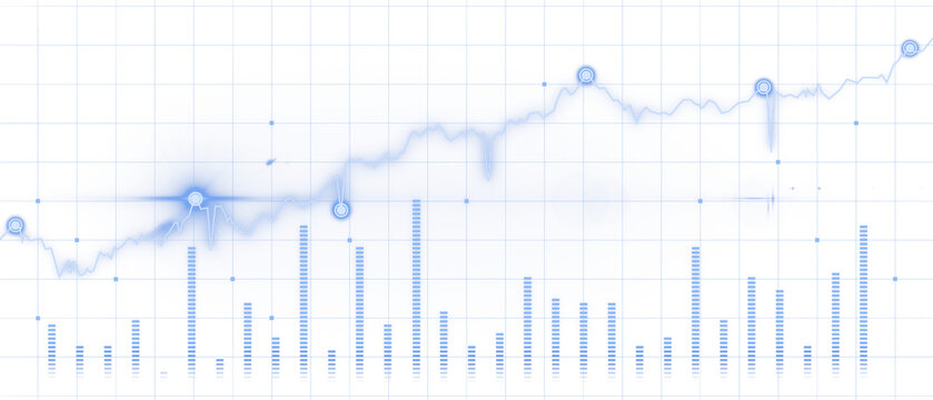 Abstract blue chart featuring line graph with glowing markers and bar graph on white grid background. Concept of data analysis and tech. 3D Rendering.