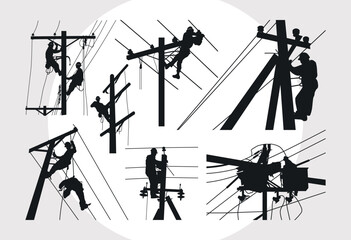 silhouette engineer working maintenance transformer on pole electric