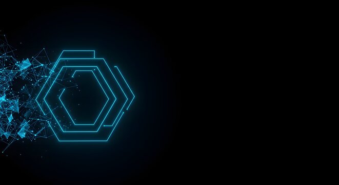 Abstract glowing blue hexagon shapes with connecting dots and lines on a dark black background design