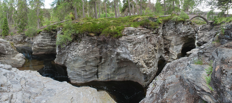 Panoramic view of the Black Linn Falls on the River Braan in the Hermitage woodland. Perthshire, Scotland, UK