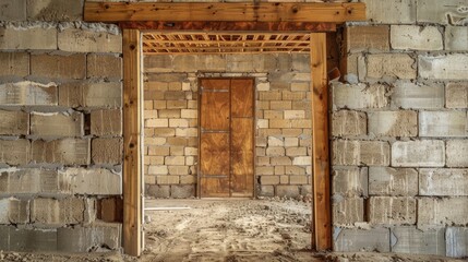 Wooden Door Lintel in Modern Home Construction. Insulated Interior Wall Frame on Building Site