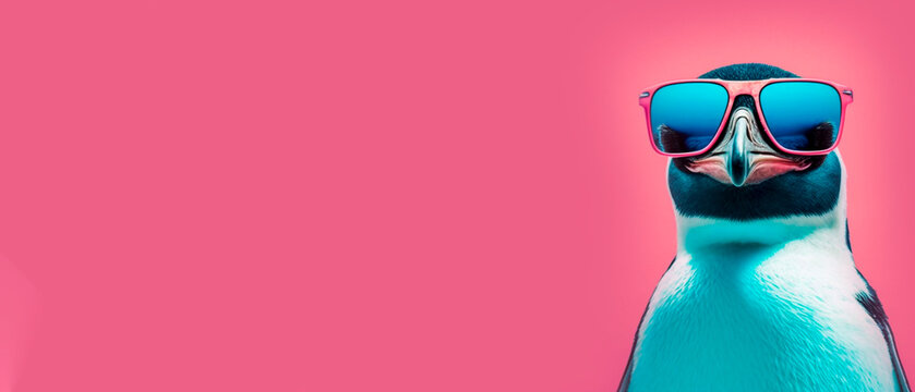 Penguin wearing pink sunglasses, pink background with copy space, generative ai