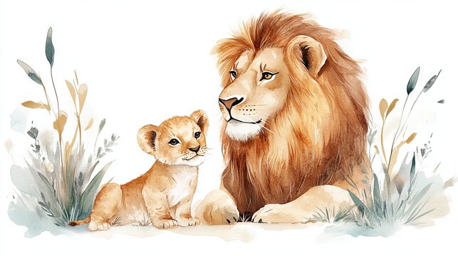 The bond between a male lion and its cub is strikingly depicted in a portrait photography composition