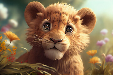 Cute adorable baby lion generative ai rendered in the style of children-friendly cartoon animation fantasy style