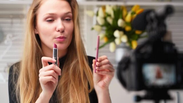 Young beautiful Asian woman and professional beauty make up artist vlogger or blogger recording makeup tutorial to share on website or social media. Business online influencer on social media concept.