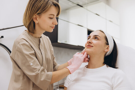 The doctor cosmetologist makes Lip augmentation procedure of a beautiful woman in a beauty salon.Cosmetology skin care. High quality photo