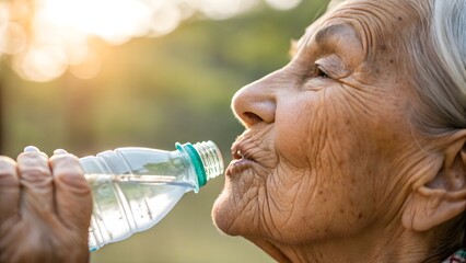 Senior lips sipping water close-up. Detailed shot of elder’s lips drinking from eco bottle, natural hydration moment.