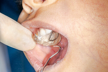 Orthodontics patient kid with a prosthetic device on the maxillary arch, mouth open and a dentist's fingers with medical glove retracting the lip and holding a dental probe cleaning the sealing cement