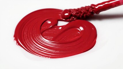 Vibrant red liquid lipstick or lip gloss being swatched with a soft applicator wand on a pristine white background showcasing its rich color and luxurious creamy texture for beauty and cosmetic produ.