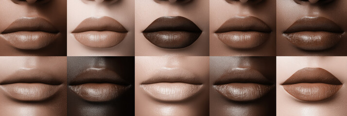 Diverse lip colors in various skin tones arranged in grid display. Different finishes and textures visible. Closeup details of lips
