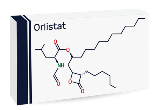 Orlistat molecule. It is lipase inhibitor used in the treatment of obesity. Skeletal chemical formula. Paper packaging for drugs.