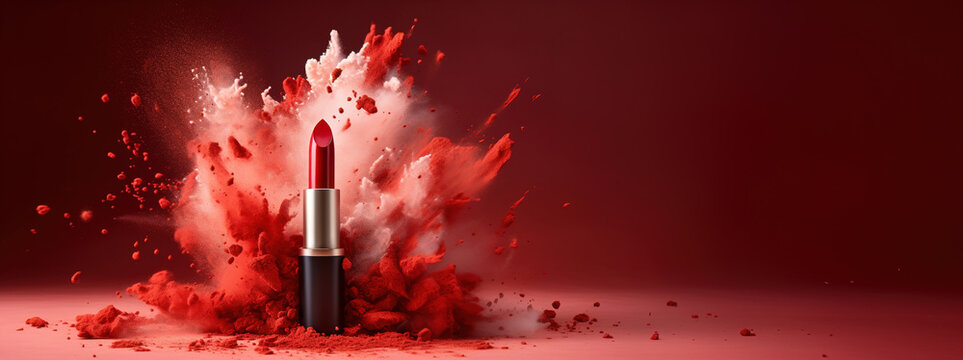 lipstick with powder burst for makeup advertisement products concept as wide banner with copyspace area - Generative AI