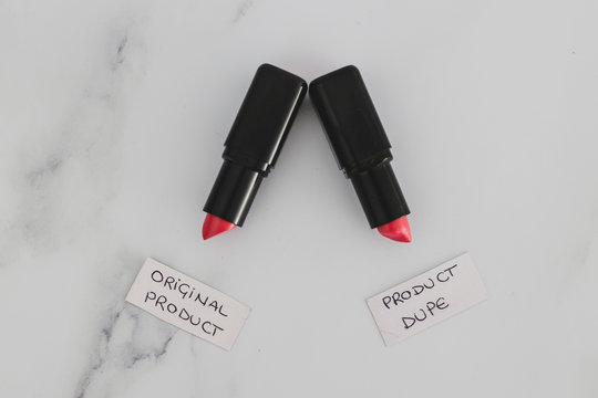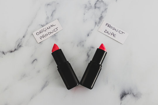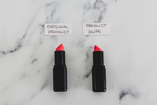 beauty industry competition, two identhical looking lipsticks with Original Product and Product Dupe labels