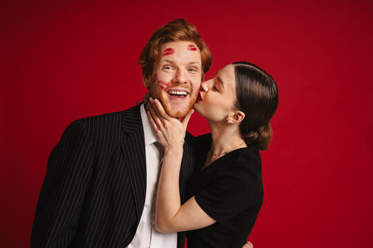 Woman kissing man with red lipstick marks on his face isolated over red wall