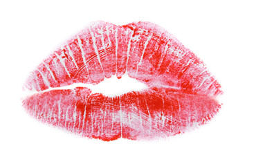 Red lipstick print on white background, closeup