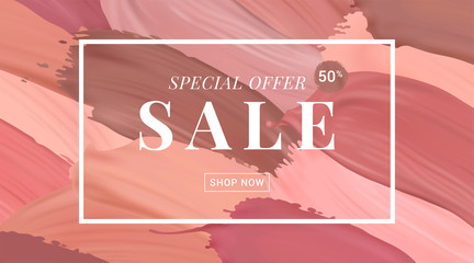 Vector sale banner with text on lipstick stokes background. Good for salons, beauty shops.