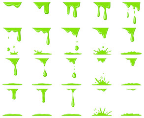 Slime animation. Dripping green cartoon drops and splash, halloween liquid toxic slime blobs vector illustration set. Green slime animation