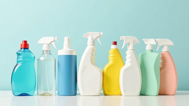 multi-colored bottles of household cleaning products.