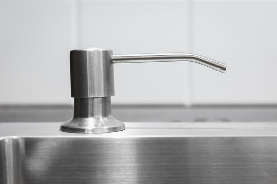 Liquid soap dispenser built into modern metal sink.