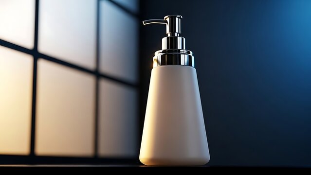 white soap dispenser bottle with silver pump on countertop near window