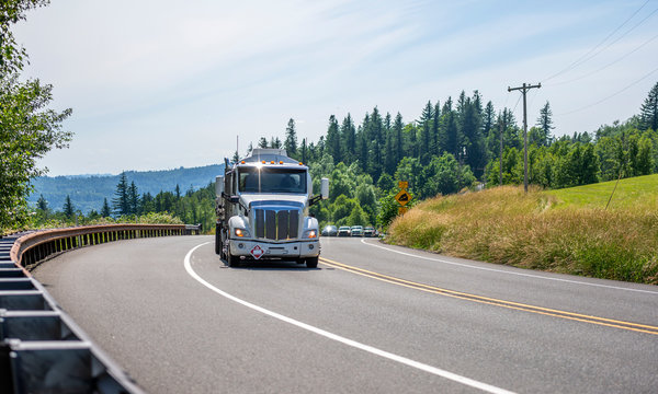 Big rig semi truck transporting flammable liquids and fuel in tank semi trailers running on the winding road