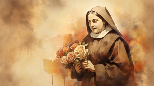 The painting of St. Therese of Lisieux Holding Bouquet of Roses at Carmelite Convent, Beige Background, Copyspace,Christian banner