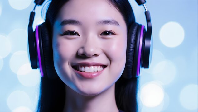 Young man enjoying music on headphones, looking at camera. casual style, modern leisure activity, youth culture. portrait with blue background. AI