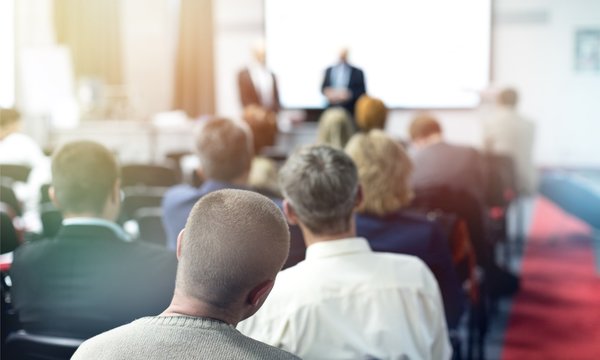 Speaker giving a talk on corporate business event. Audience at the conference hall. Business and Entrepreneurship event.