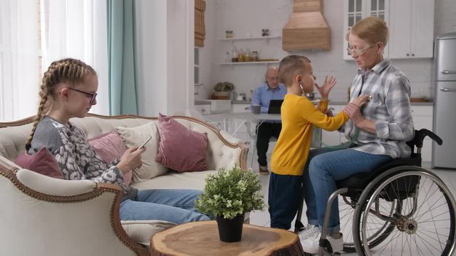 Curious preschool boy listening to disabled grandmother's heartbeat with stethoscope. Handicapped grandma in wheelchair teaching grandson to use stethoscope, granddaughter and granddad using gadgets