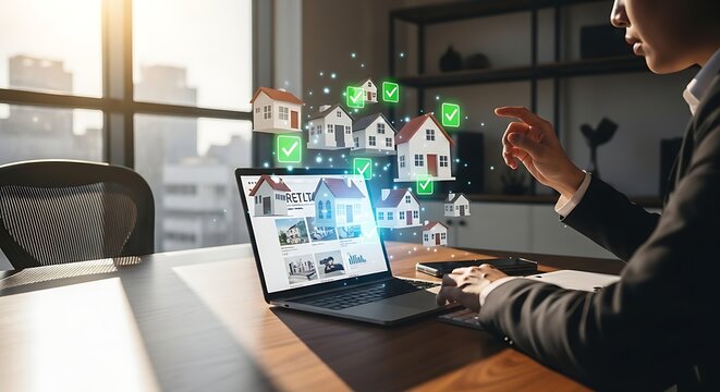 Real estate management concept, User navigating a digital home listings platform in a contemporary workspace, leveraging tools for real estate management, checklist planning, and property evaluations.