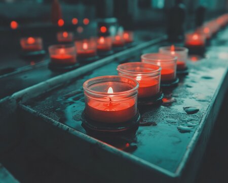 A row of colorful candles burns softly in a church, casting a warm glow that evokes feelings of hope and faith during sacred observances like Easter