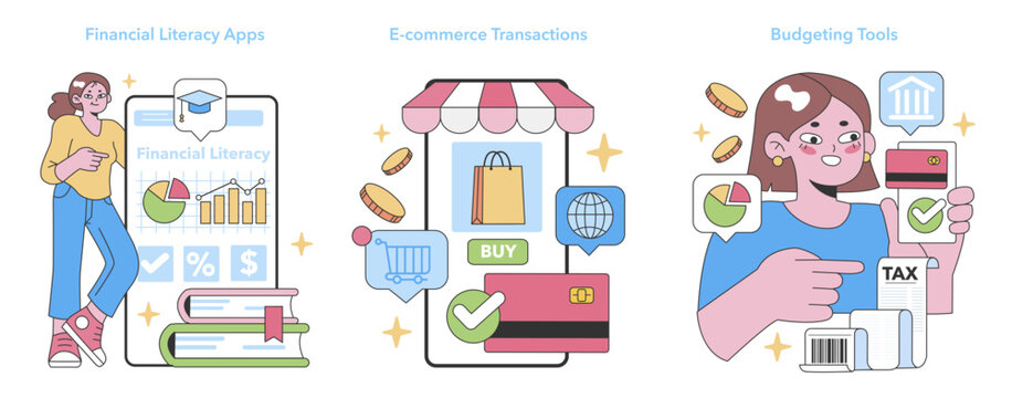 Financial Empowerment Tools set. Illustrates financial literacy apps, e-commerce transactions, and budgeting tools. Enhancing fiscal understanding. Flat vector illustration.