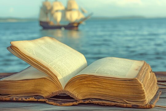 Sailing Through Stories: Old Book Beside a Ship's Grandeur