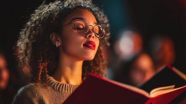 Woman with curly hair reads passionately while engaged in a group setting during an evening gathering