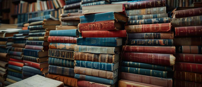 Stacks of old books — for articles on literature, education, antiques, and interior design.