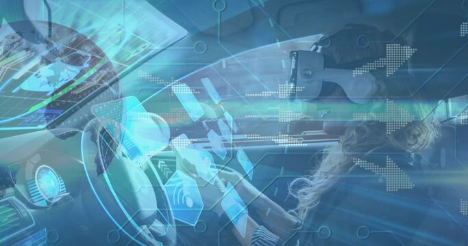 Screens of network of connections and data processing over man wearing a vr headset driving a car