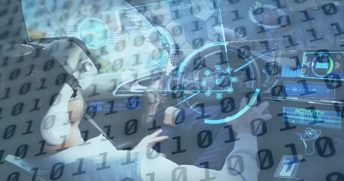 Binary coding data processing against man wearing vr headset sitting in self driving car