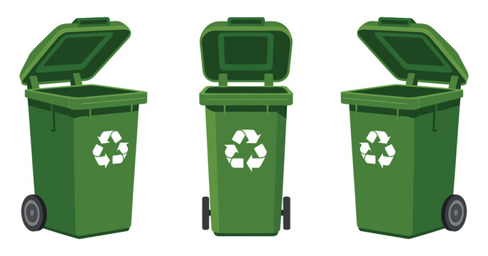 Three Green Recycling Bins with Open and Closed Lids for Waste Disposal and Recycling Programs