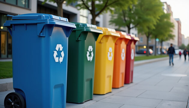 Colorful recycling bins set with recycle symbol, eco-friendly waste containers, green, black, blue, and yellow trash bins, vector illustration with transparent background
