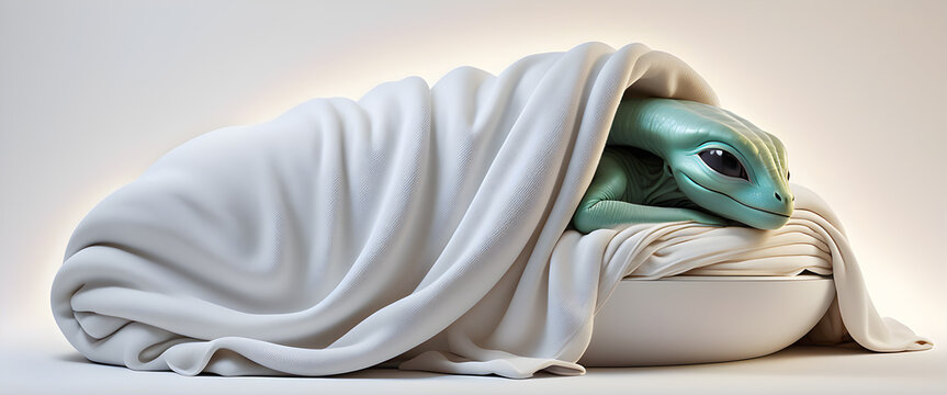 A small, green alien with a sleek body is trying to sleep under a blanket, Generative Ai